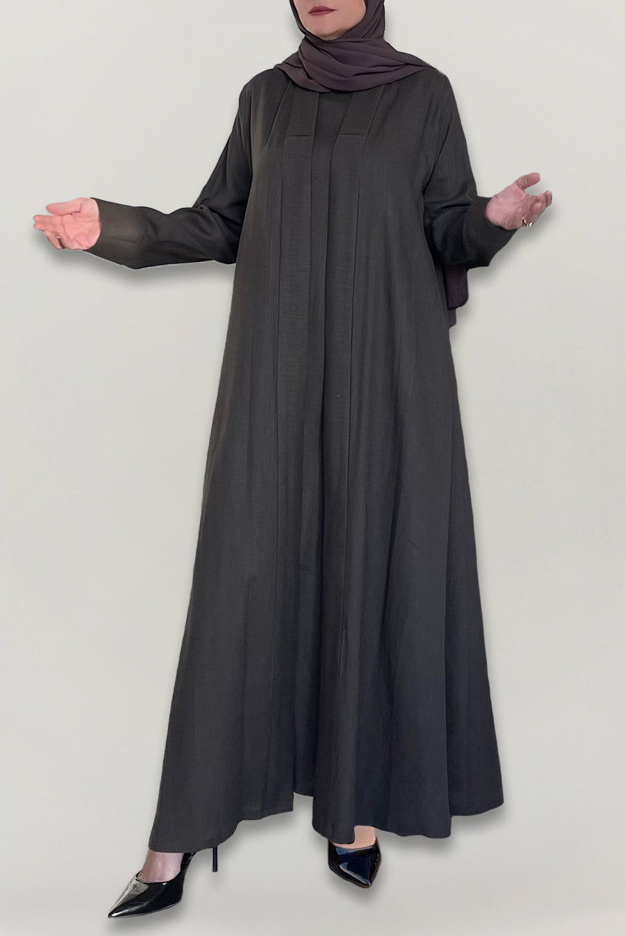 Morooj, A Charcoal Brown Colored Linen Abaya, radiating elegance and simplicity. Crafted from premium Linen fabric, its sleek and minimalist design offers a polished and versatile look, perfect for both formal occasions and casual outings. The delicate Charcoal Brown color adds a subtle sophistication, making it a standout piece in any wardrobe. With its flowing silhouette and included matching Shayla, Morooj Abaya ensures a graceful and cohesive appearance. Whether you’re attending an event or elevating your everyday style, this abaya combines comfort and elegance effortlessly. To maintain its impeccable beauty and quality, professional dry cleaning is recommended.